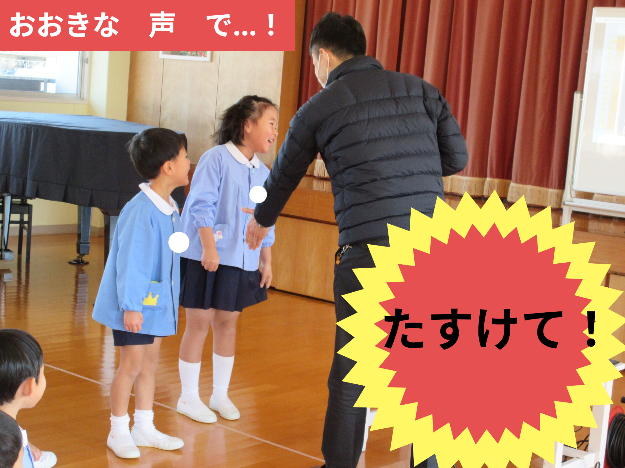 先生の声をよくきいて、お友達と一緒に園庭へ避難!