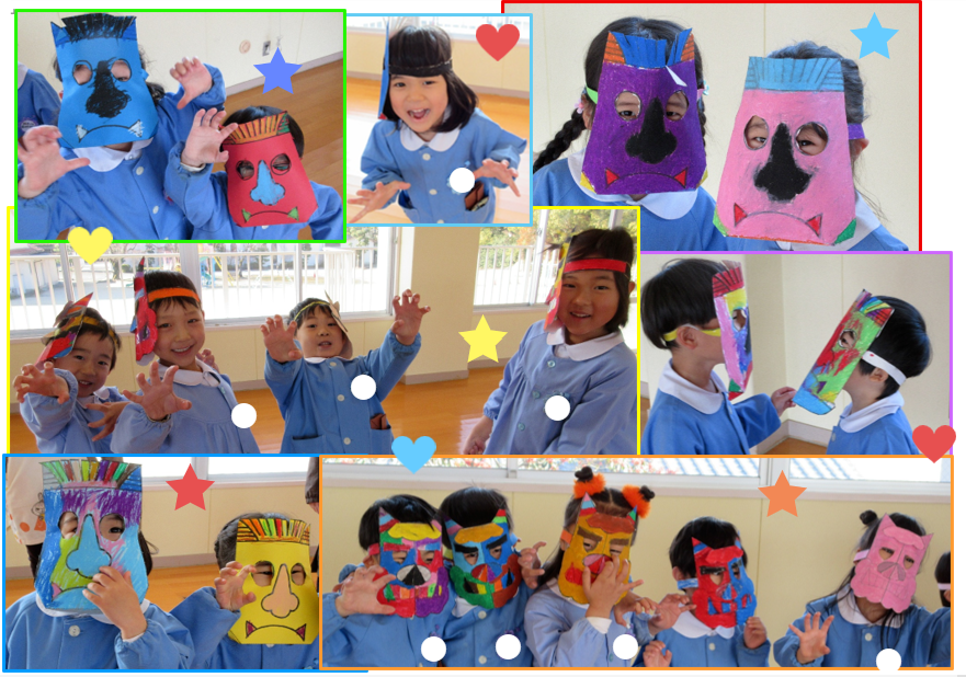 カラフルな手作りのオニのお面をつけて